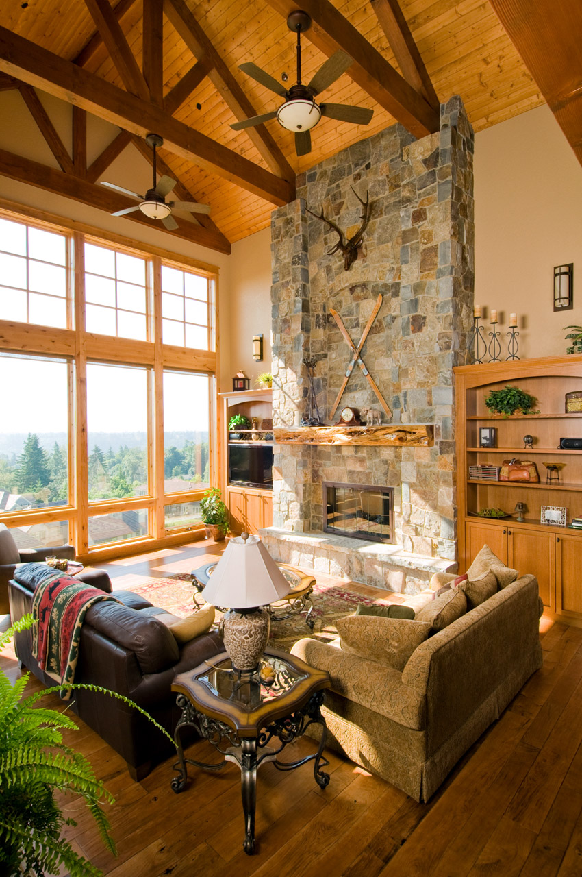 Built atop the hill at Barrington, this home is among our best work. Designed for the feel of a Rocky Mountain ski lodge, this home is full of big timbers and log accents. The natural stone fireplaces and interior walls portray a very solid appearance. The stairs are built from timbers, and are mortise and tenon construction. The home was designed by Curt Olson of Olson Group Architects, and decorated by Joelle Jarvis of Ronda Divers Interiors. Timber, stone and siding details were by Riverland Homes, Inc.